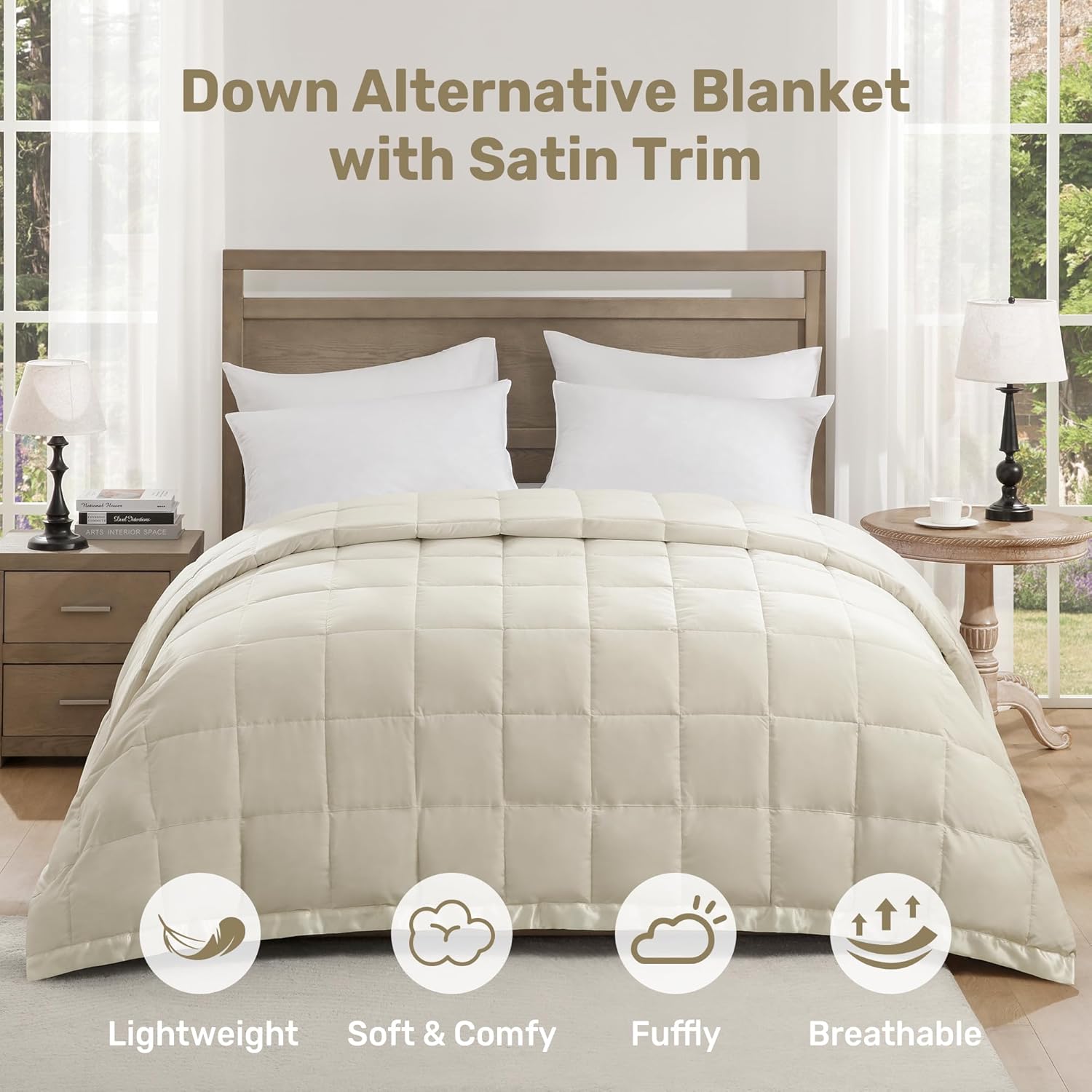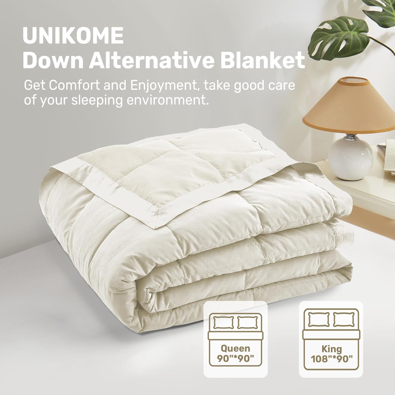 • UNIKOME Blankets Queen Size – Soft Lightweight Retro Down Alternative Blankets with Satin Trim, Cozy Luxury Bed Blanket for All Season, Cream (90″X90″)