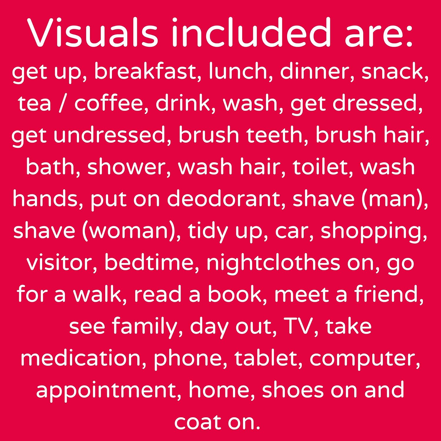 • Visual Schedule for Adults (Red) Visual timetable for dementia, stroke victims, adults with learning difficulties, autistic adults.