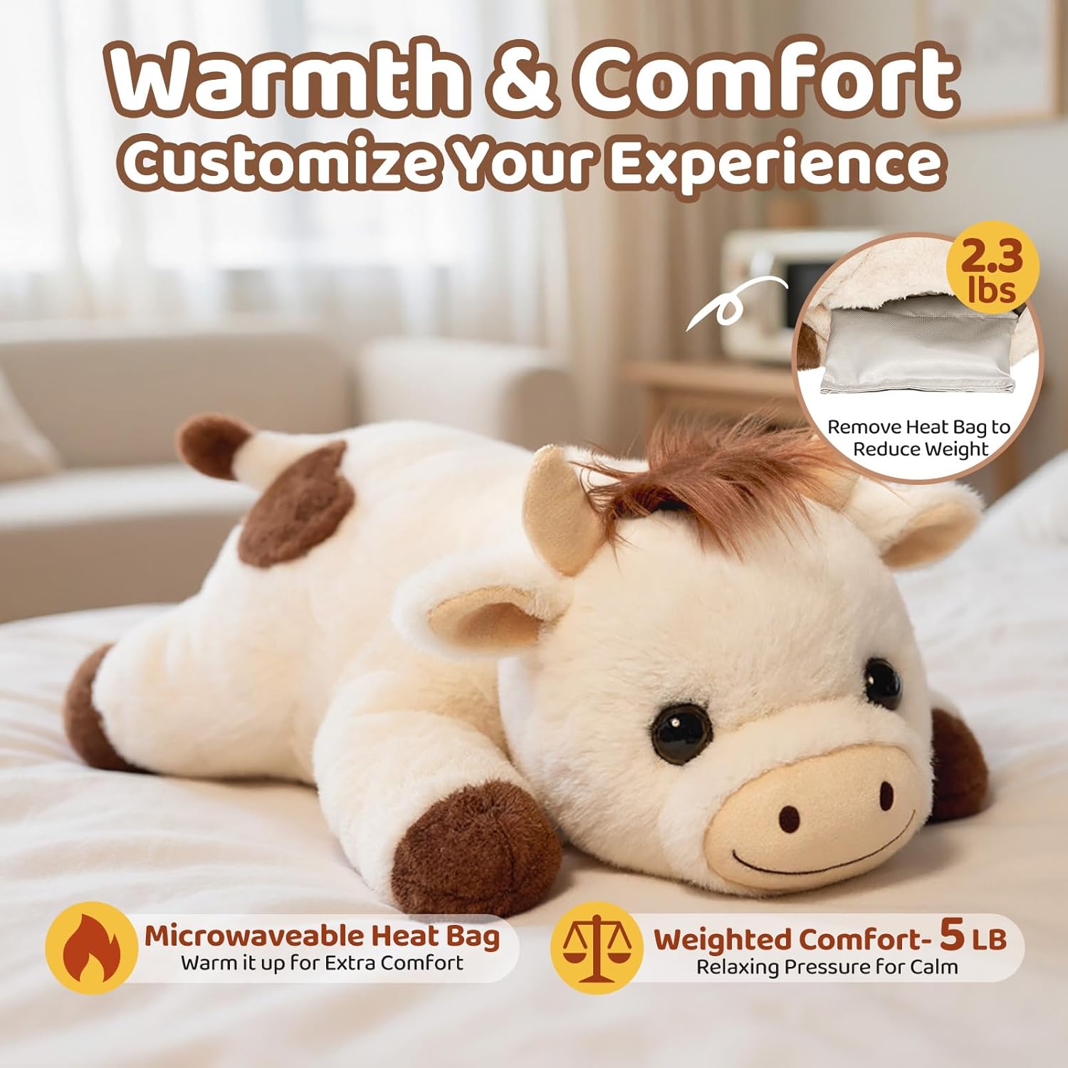 5lb or 2.13lb Adjustable Weighted Calm Companion-This cow weighted plush weighs 5 kilos, that includes a detachable microwavable heating pad and glued bead-filled limbs for deep embrace, stress reduction, and sensory consolation. Take away the heating pad to cut back the burden to 2.13 kilos. At bedtime, this heatable weighted stuffed animal doubles as a comforting companion for youths & adults, serving to them really feel calm and safe by way of the night time.