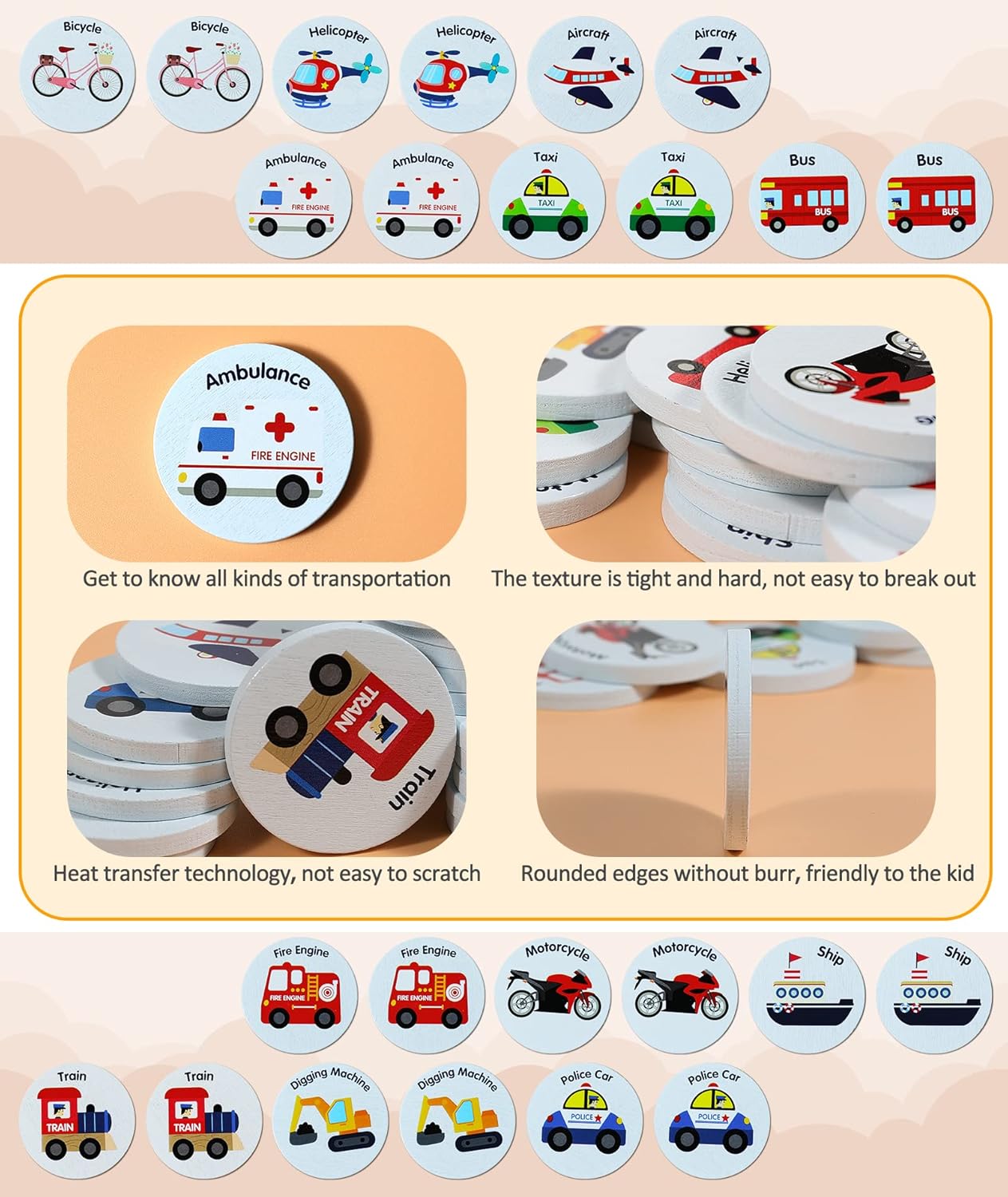 🚗【Secure and Sturdy Materials】Made from pure wooden, this reminiscence Match card is non-burr for youngsters to play with. The patterns are printed in non-toxic ink and heat-treated, extra sturdy, and scratch-resistance, water. Corners are polished to make sure no burrs. It has been examined by an impartial third-party laboratory and located to be innocent to people.