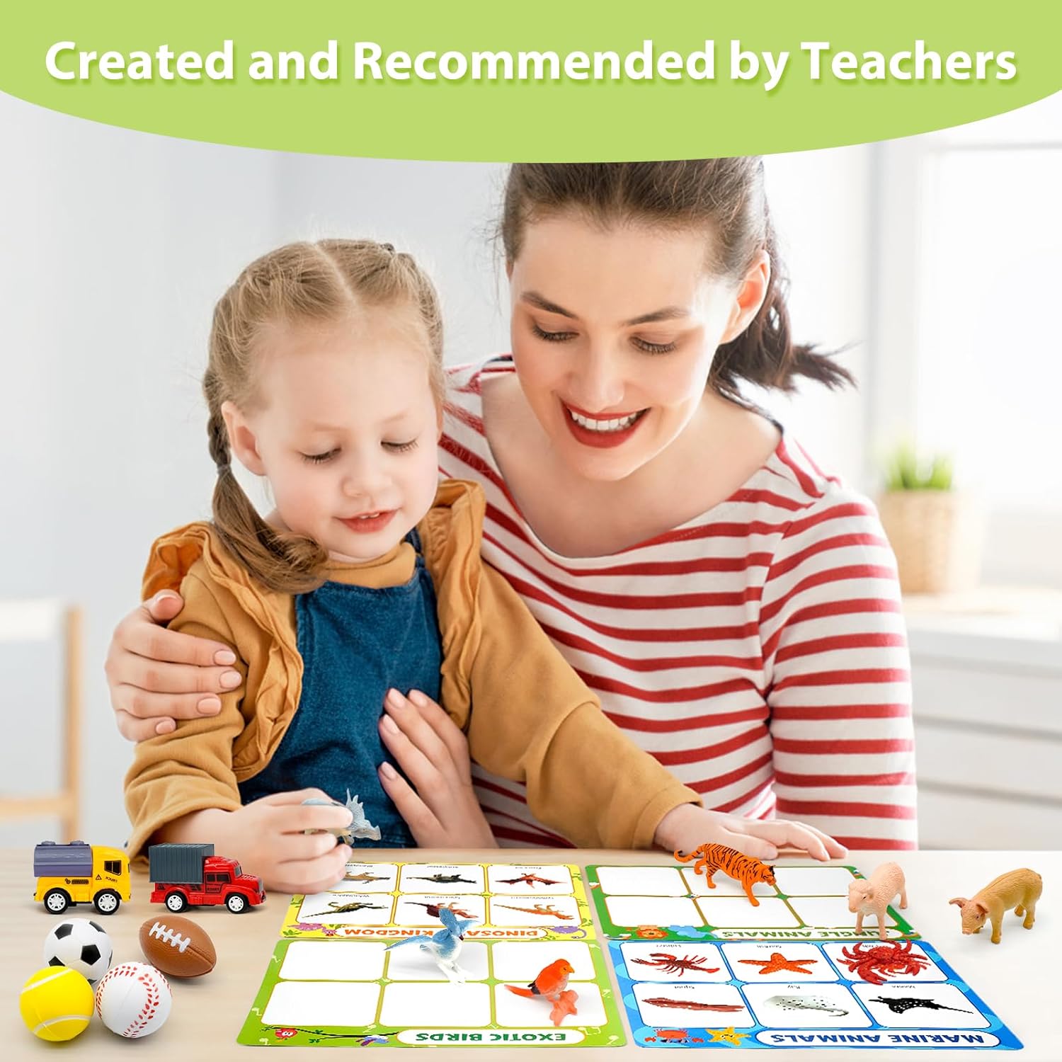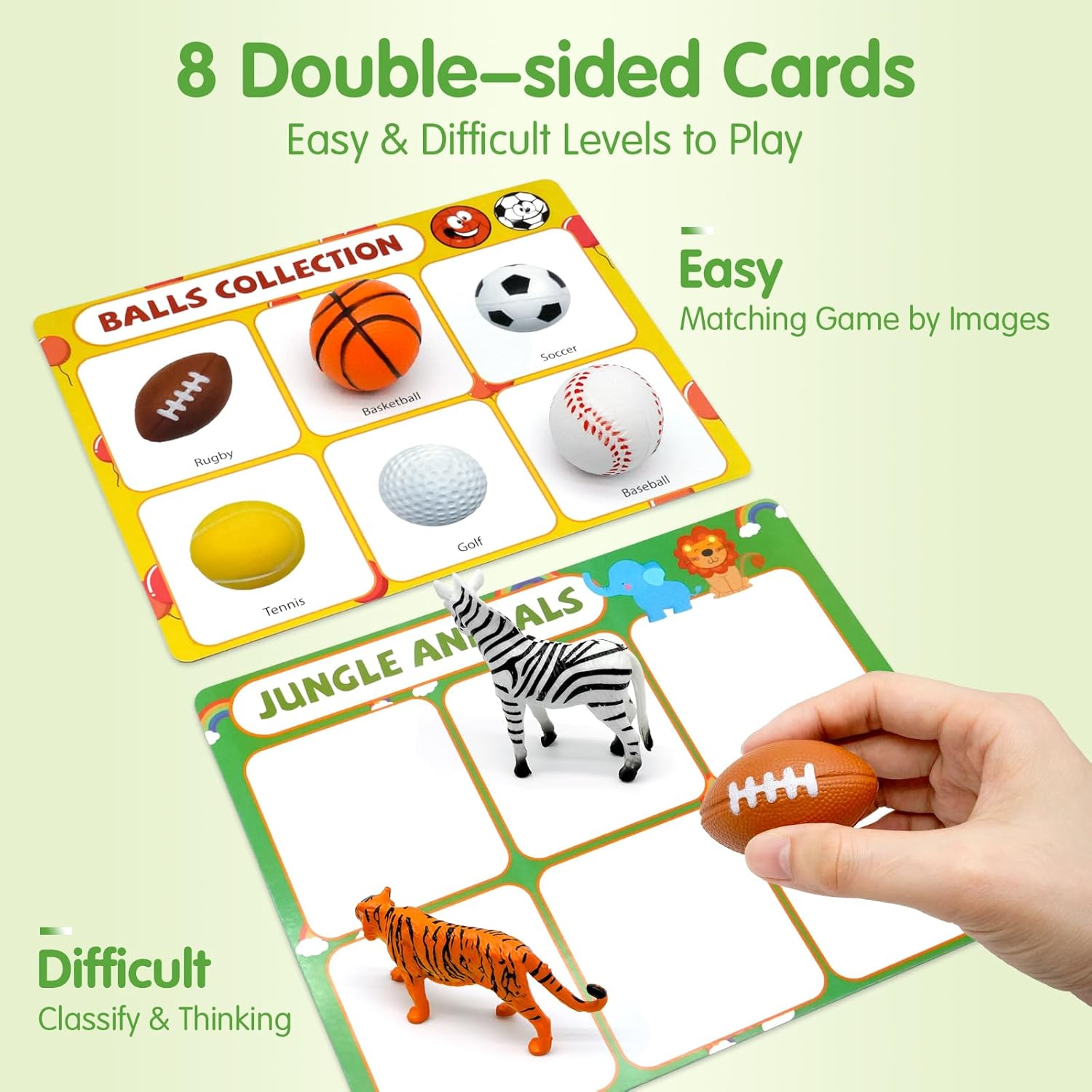 8 THEMED SORTING & MATCHING TOY: Preschool toys embrace 6 jungle animals, 6 cattle, 6 building pull-back vehicles, 6 birds, 6 fruits, 6 balls, 6 marine animals, 6 dinosaurs, 8 exercise playing cards, and 1 storage bag. The cardboard has wealthy content material on each side. One aspect with classes, pictures, and vocabulary, youngsters solely want to seek out the corresponding toys to finish the sorting video games; the opposite aspect signifies the class, so youngsters must classify toys by means of unbiased considering and reminiscence