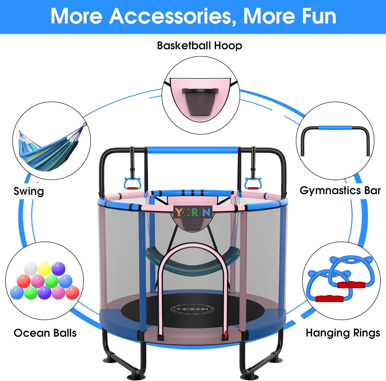 【YORIN Supplies Extra Enjoyable】YORIN 55-inch trampoline with swing, basketball hoop, gymnastics bar, ocean balls and hanging rings. Detachable basketball hoop and swing permit your children to take pleasure in capturing whereas leaping and luxuriate in swinging of their free time. The peak of the gymnastics bar is adjustable from 55.11” to 59.06” or 62.99”, and with 2 hanging rings, which might train your kid’s bodily health and steadiness. Colourful ocean balls enable you practice your kid’s shade recognition as nicely.