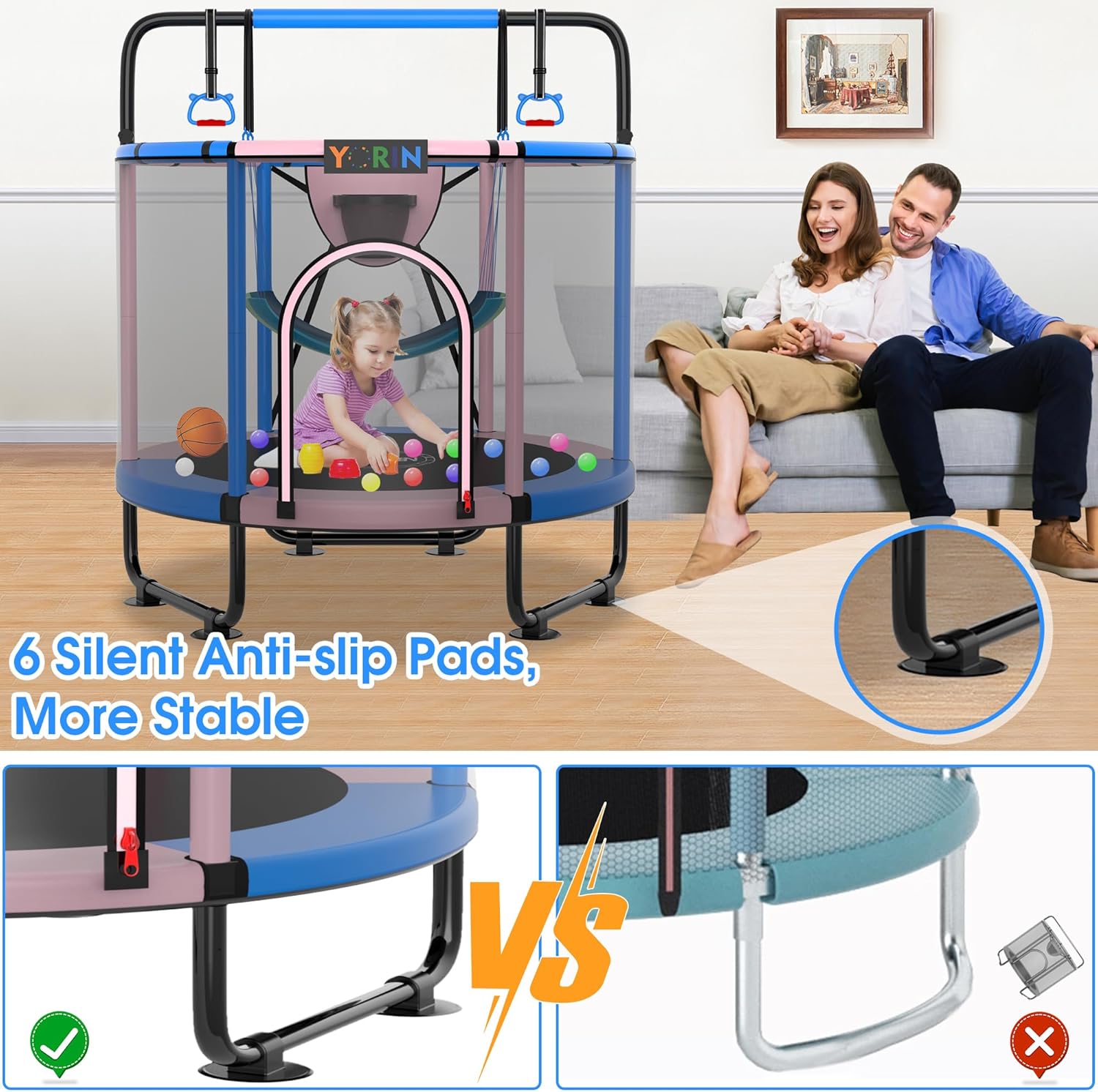 【YORIN Mini Trampoline】YORIN 55in trampoline with enclosure and basketball hoop adjust to ASTM F381-16 & F2225-15, CPC Certificates and CPSIA Report. YORIN Mini trampoline can accommodate 1-2 children aged 1-8 years. 3 W-shaped legs with silent suction cups, successfully mute and strongly take in the bottom, mixed with 6 vertical and 6 cross-bar security poles improve the steadiness and security of the trampoline, offering all-round security safety.